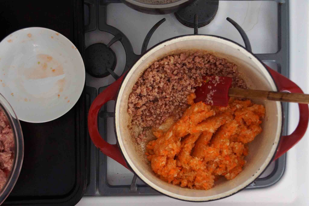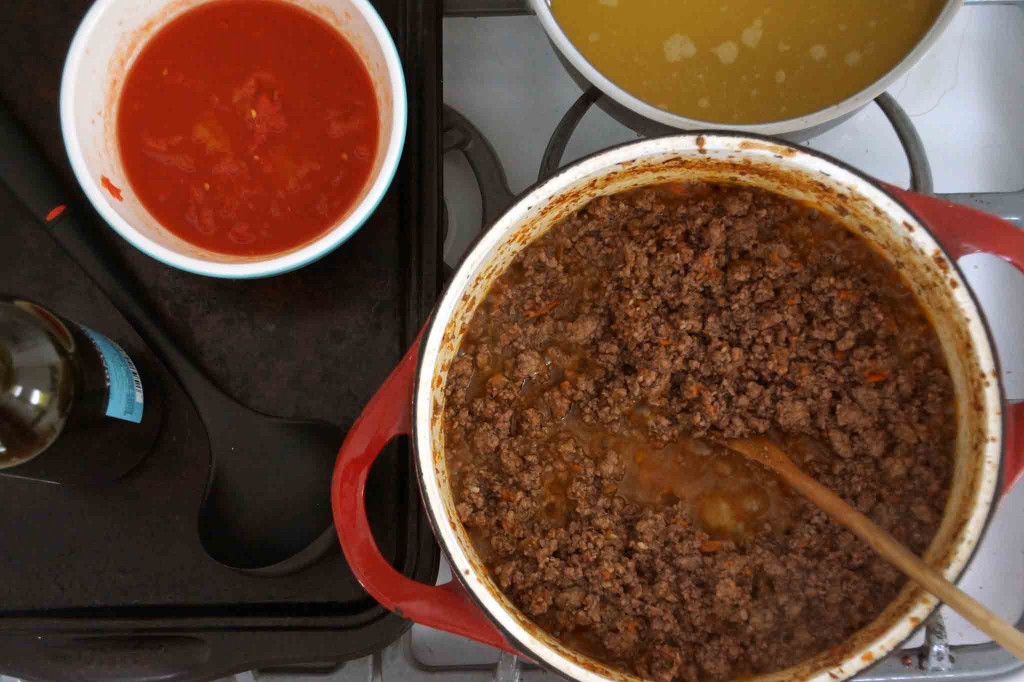After the carrot mixture has cooked for a few minutes, go ahead and add all of the ground meat. Brown the meat, breaking it up into small pieces and tossing it with the sautéed vegetables as you go. The meat will start get very juicy–remember all that wine you dumped over it? Let the pot bubble away until most of the liquid has cooked off.