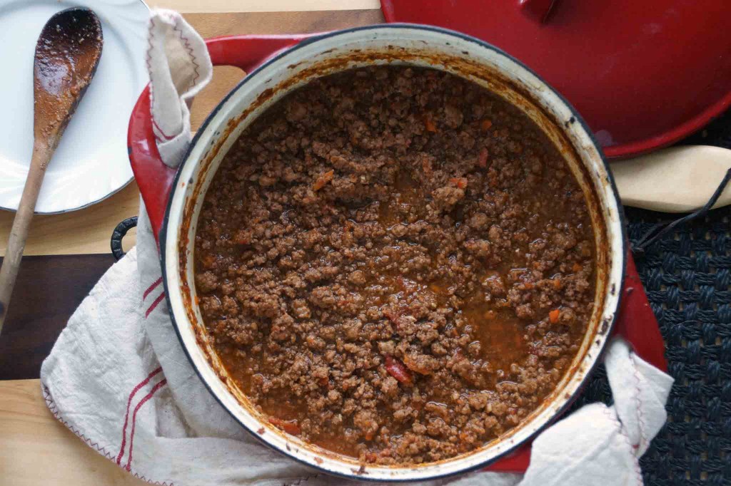 - Push the vegetable and bacon mixture to the side, creating as large of an empty spot as possible, and add the meat. Season the meat with about ½ tsp. kosher salt and brown it, breaking up any clumps that start to form and making sure nothing is sticking to the bottom of the pan. Stir the vegetables into the browned meat as you go. The meat will throw off a lot of juice and fat to the point of almost being covered in liquid. Keep cooking, stirring often, until all of the liquid has cooked off, about 30 minutes. As the liquid level drops, lower the heat so the bottom of the pot won't burn.