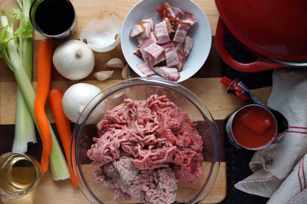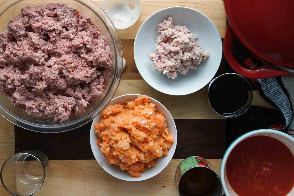 Massage some white wine into the ground meats, breaking it up into small pieces with your fingertips. Using the food processor, puree the bacon and garlic into a paste, then transfer to a bowl. Now pulse the carrots, celery, and onion into fine pieces. Plop the tomatoes into a bowl and crush them with your hands. Grab your Dutch oven and you’re ready to get cooking.