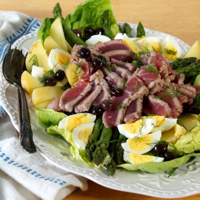 Once you’ve got everything prepped, compose your salad. It’s fun and you’ll feel like an artist. You could divide everything between individual plates but I dig the look of a large, family-style platter–it’ll make dinner feel like a party, even if it’s not. Spread large lettuce leaves around the outside of the plate and layer on blanched asparagus and wedges of potatoes. Drizzle with a lemony vinaigrette and sprinkle with herbs and sliced shallots. Peel and quarter your eggs and nestle them in among the potatoes. Season, sear, and slice your tuna, then fan it out atop the salad. Scatter a handful of tiny purple olives around the platter, and call everyone to the table.