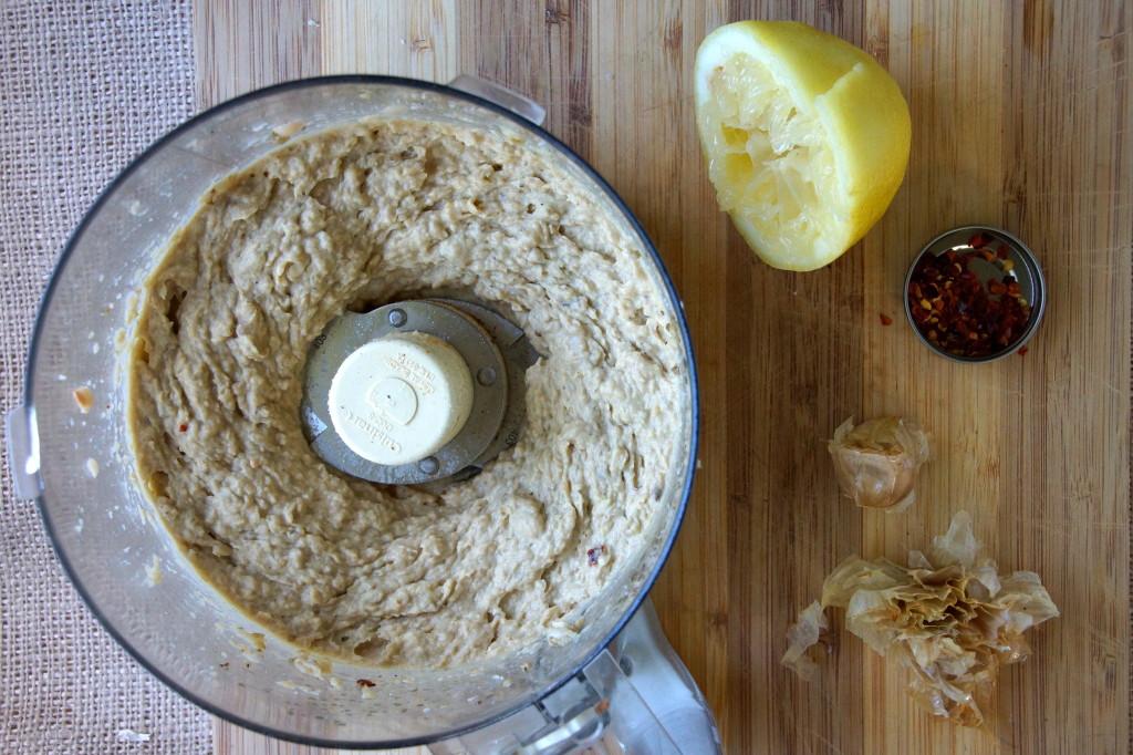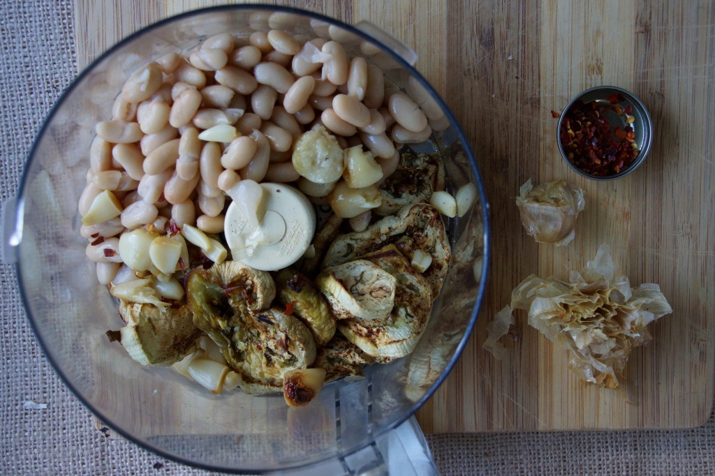 Roasted Eggplant and GarlicAs soon as the roasted garlic is cool enough to handle, squeeze the cloves out and toss ’em in the food processor with the beans and eggplant.