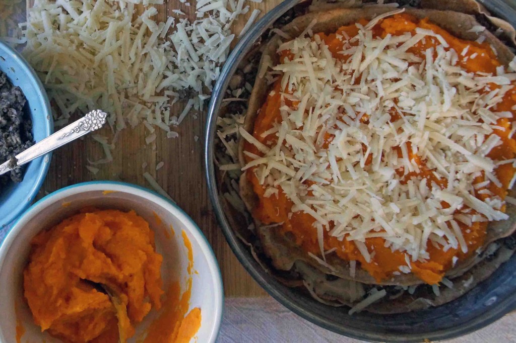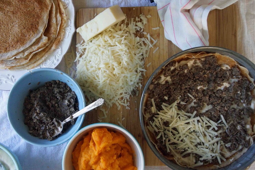 Start building your lasagna. Line the bottom of the pan with crepes, then layer on béchamel, mushroom duxelles, and cheese. Cover with another crepe layer and spread with squash puree, sprinkle with cheese. Repeat until you’ve used up all your ingredients.