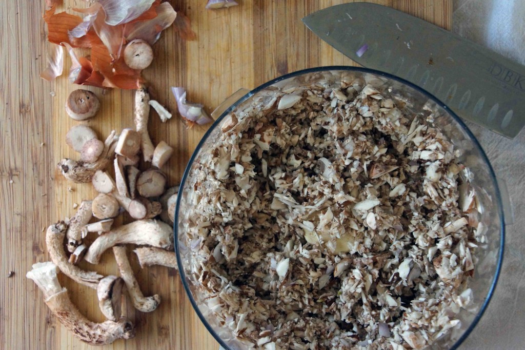 Quarter the mushrooms, pop them in a food processor with a shallot, and pulse until finely chopped. We’re making mushroom duxelles. If you don’t wait tables for a living and aren’t familiar with the term, just know it’s a fancy way of saying super-tasty mushroom spread. Seriously, I could put it on anything and everything.