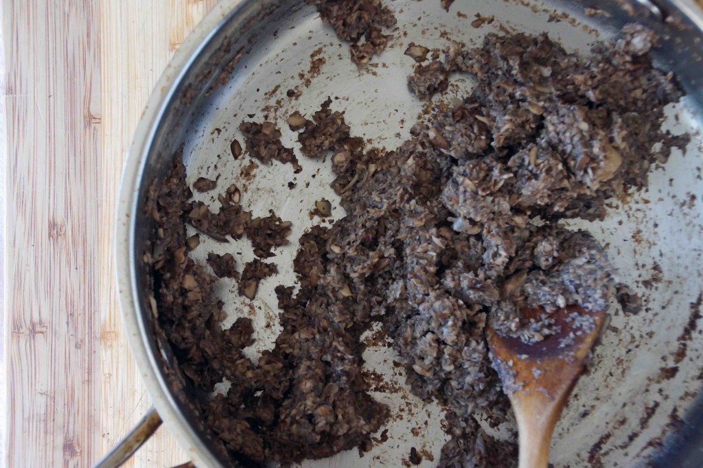 Saute the mushroom and shallot mixture in butter until the liquid from the mushrooms boils off and you are left with a thick and fragrant mushroom paste. Stir in a splash of dry Marsala and try not to eat it all right off the spoon.