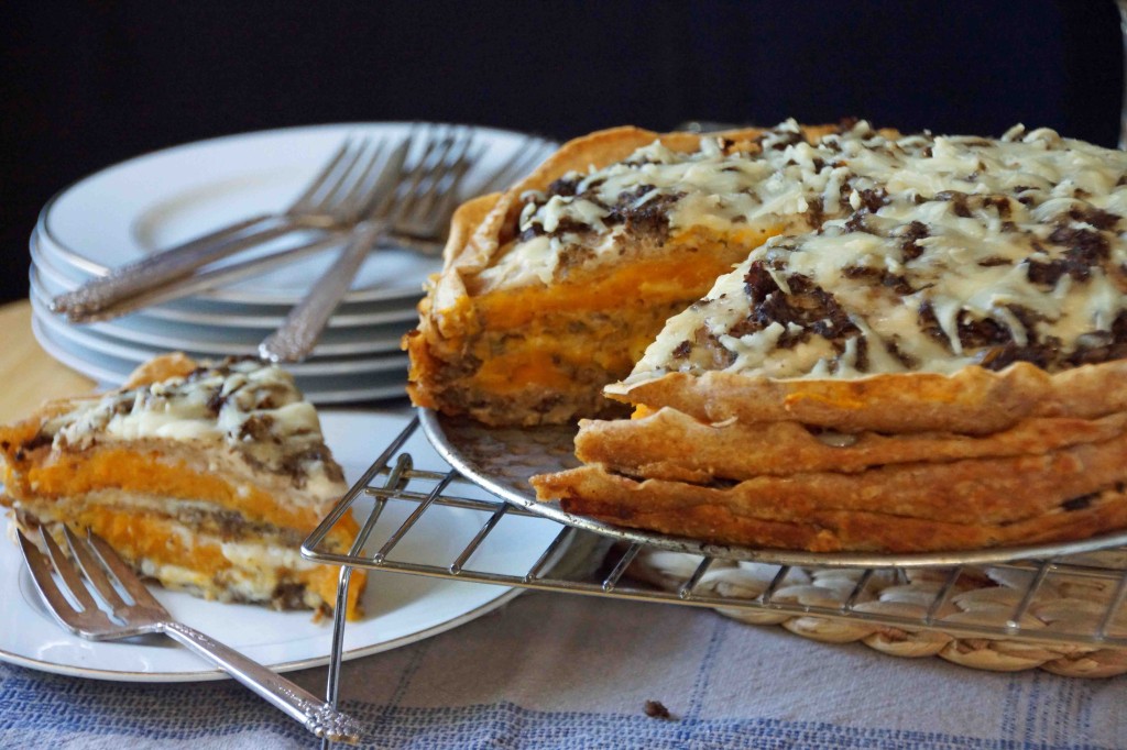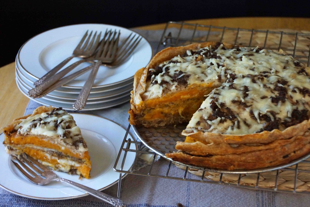 - Time to assemble the lasagna! Butter a spring-form pan. Create a base with a crepe. My crepes were not quite large enough to make a full layer, so I pieced each layer together with 1 full crepe and pieces of another. It didn't make any difference in how the end product looked or tasted. Spread the crepe with about 1/3 of the béchamel sauce followed by 1/3 of the mushrooms. Sprinkle with a little cheese, then top with another layer of crepes. Spread the crepe with about 1/2 of the squash puree, sprinkle with cheese, and top with another crepe. Repeat. End with a béchamel and mushroom layer topped with plenty of cheese. Cover the lasagna loosely with foil with a few holes in the top to let the steam escape. Make sure the foil does not touch the cheese or it will pull it all off when you remove it. Place the spring-form pan on a baking sheet and bake at 375° for 30 minutes. Remove the foil and bake for another 15-20 minutes until the cheese is melted and the edges start to crisp. Allow to cool for 15 minutes (it will be much easier to cut) before serving.