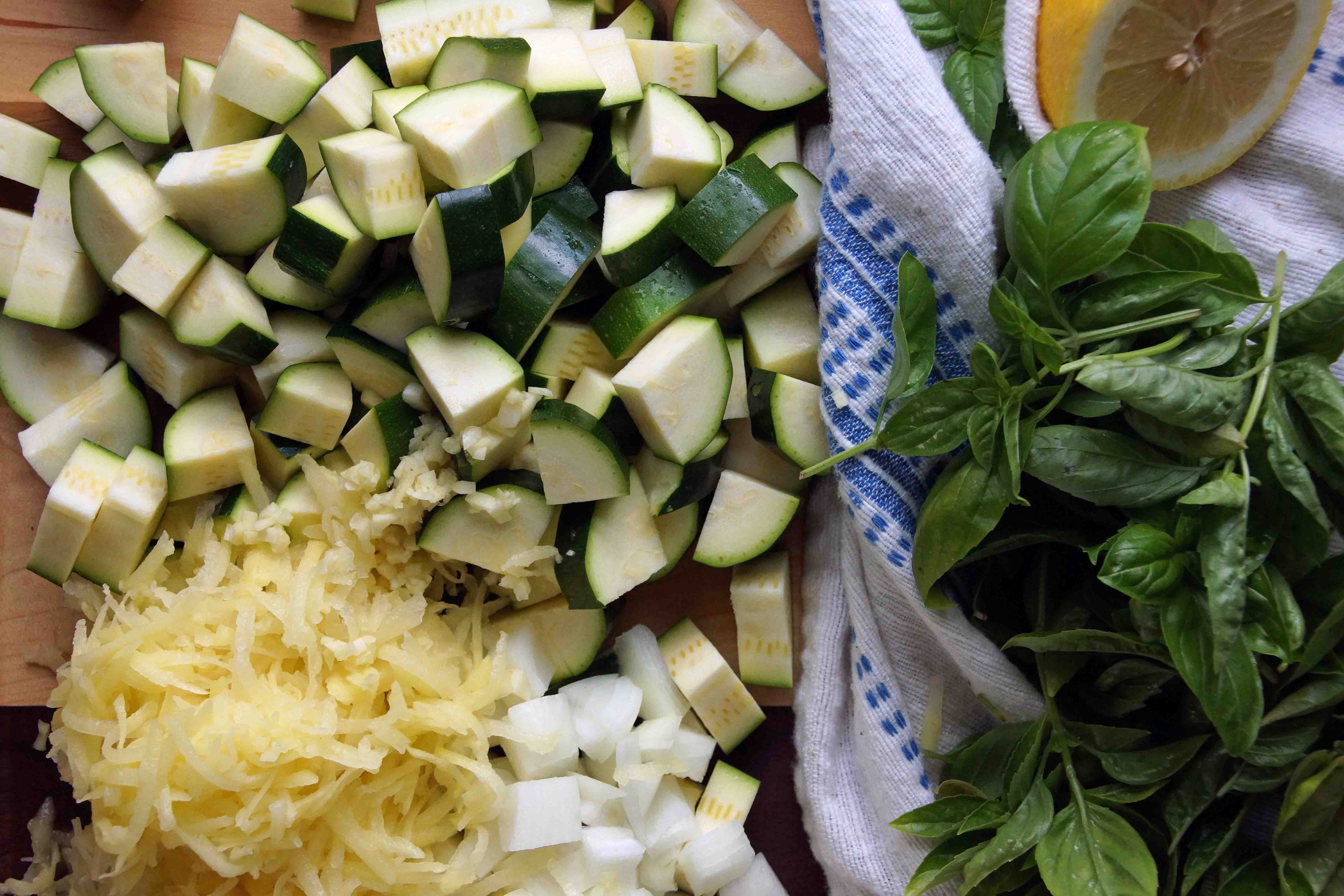 Let’s get the soup on. Grab a few zucchini, a potato, a bunch of basil, an onion, and a clove of garlic and get chopping.